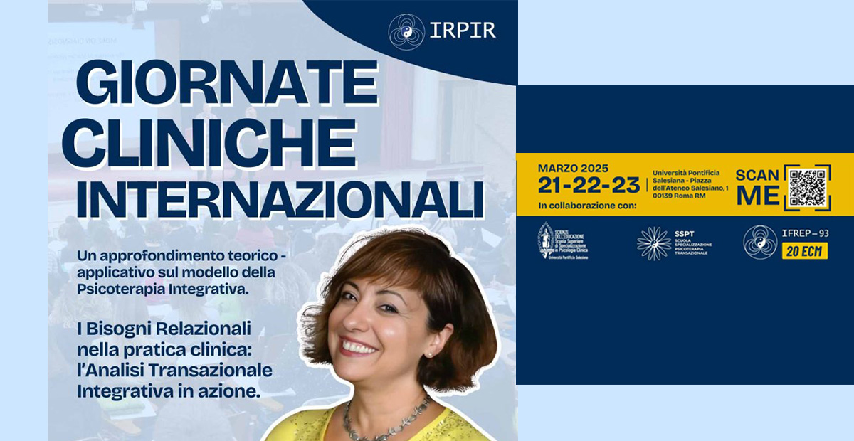 L’Associazione IRPIR, in collaborazione con le Scuole di Specializzazione SSPC-IFREP, la SSSPC-UPS e la SSPT-SAPA, organizzano a Roma le Giornate Cliniche Internazionali, dal 21 al 23 marzo, dal titolo: I Bisogni Relazionali nella pratica clinica: l’Analisi Transazionale integrativa in azione. Sarà con noi Amaia MAURIZ (TSTA), psicologa clinica, docente e supervisore dell’Associazione Internazionale di Psicoterapia Integrativa, una focalizzazione psicoterapeutica fondata da Richard Erskine, […]
